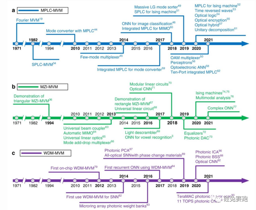 以下是光子矩阵计算三种主要方法的进展时间线,摘自Photonic matrix multiplication lights up photonic accelerator and beyond (Zhou et al., Nature 2022).。这三种不同的方法分别是平面光转换(PLC)、马赫-曾德干涉仪(MZI)和波分复用(WDM)。