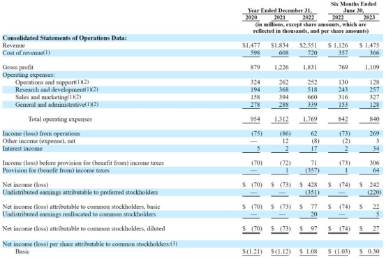 到2023 年上半年,Instacart依然保持着增长的态势。营收为14.75亿美元,2022年同期营收为11.26亿美元;净利润为 2.42 亿美元,而 2022 年同期亏损 7400 万美元。