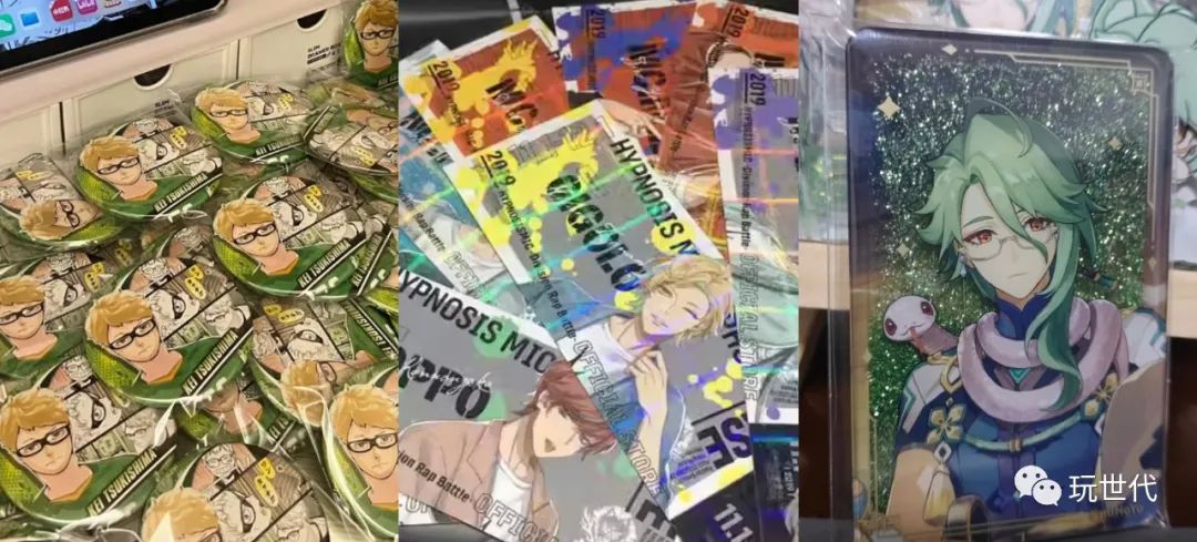 但在繁多的品类中,“镭射票、吧唧、流麻”,才是谷圈最朴素的“地三鲜”。吧唧就是最常见的徽章;镭射票是一种强观赏性的票纸;流麻是“流沙麻将”的简称,是一种夹心含闪烁细沙的亚克力板,翻转可见细沙流动。