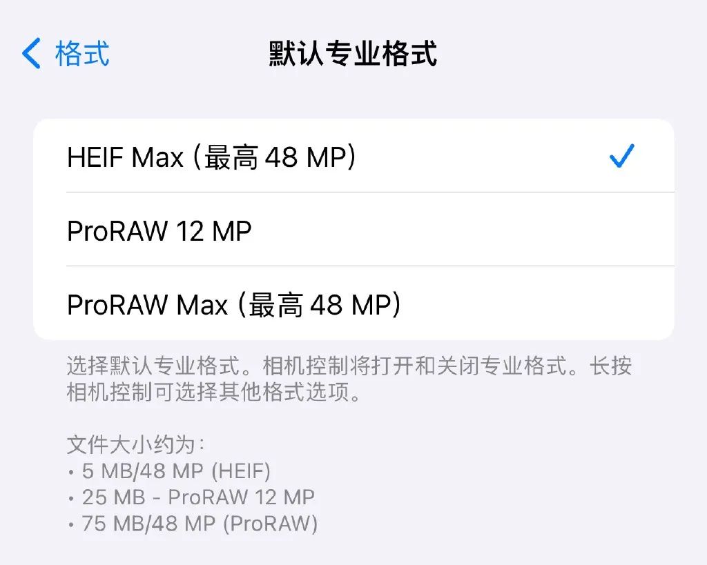 大家可以打开设置-相机-格式--ProRAW与分辨率控制--默认专业格式中,选择相应的选项。