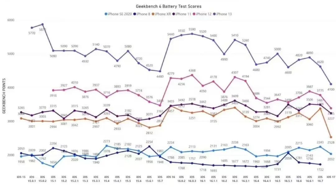 有媒体 iAppleBytes,使用 Geekbench 的 Battery Test 进行测试,这些旧款iPhone升级 iOS 17 后,耗电情况变化很大。