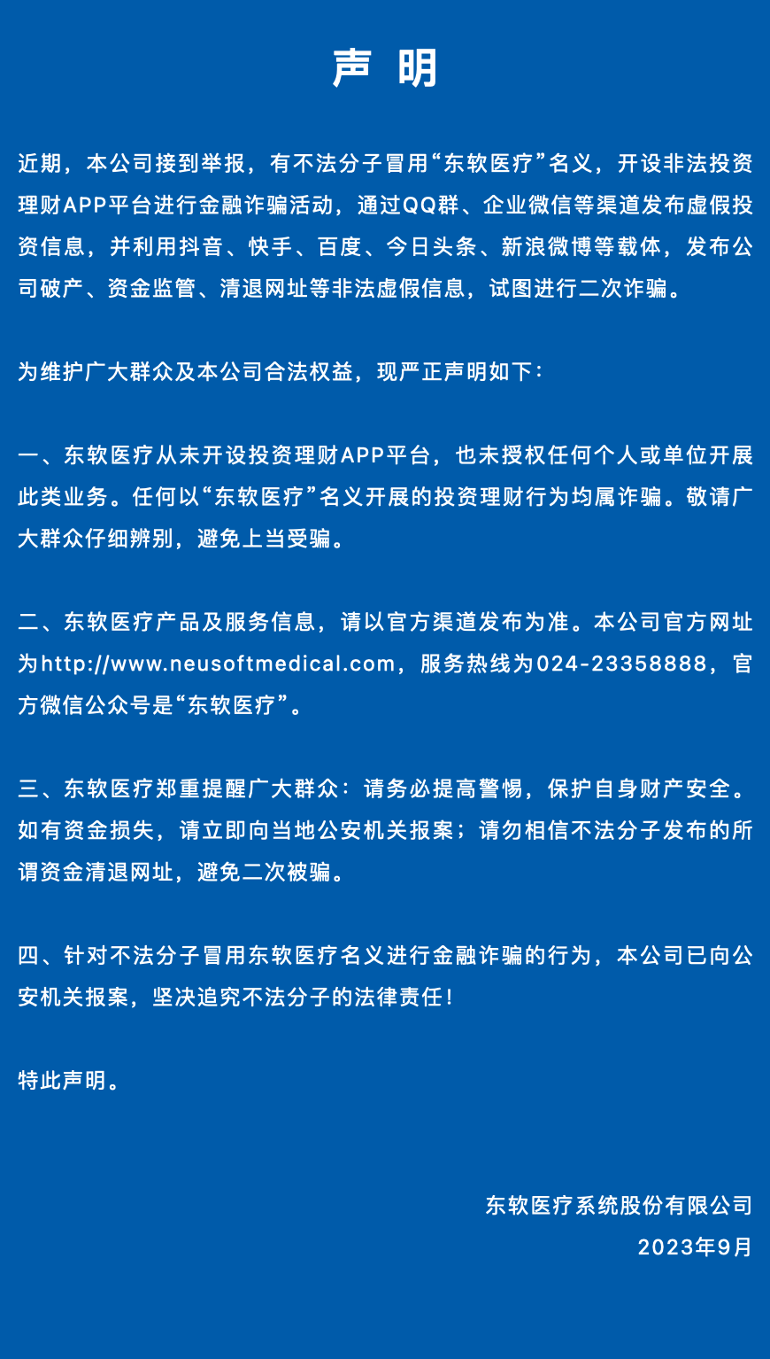 东软医疗9月20日发布声明称,近期,公司接到举报,有不法分子冒用“东软医疗”名义,开设非法投资理财APP平台进行金融诈骗活动,通过QQ群、企业微信等渠道发布虚假投资信息,并利用抖音、快手、百度、今日头条、新浪微博等载体,发布公司破产、资金监管、清退网址等非法虚假信息,试图进行二次诈骗。