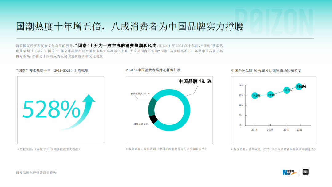 根据新华网联合得物App于2022年发布的《国潮品牌年轻消费洞察报告》显示,对比10年前,“新国货”“国潮”的关注热度(关键词搜索等数据)增长超5倍,78.5%的消费者更偏好选择中国品牌。在全行业国潮品牌消费中,“90后”“00后”贡献了74%,成为国货消费的绝对主力。