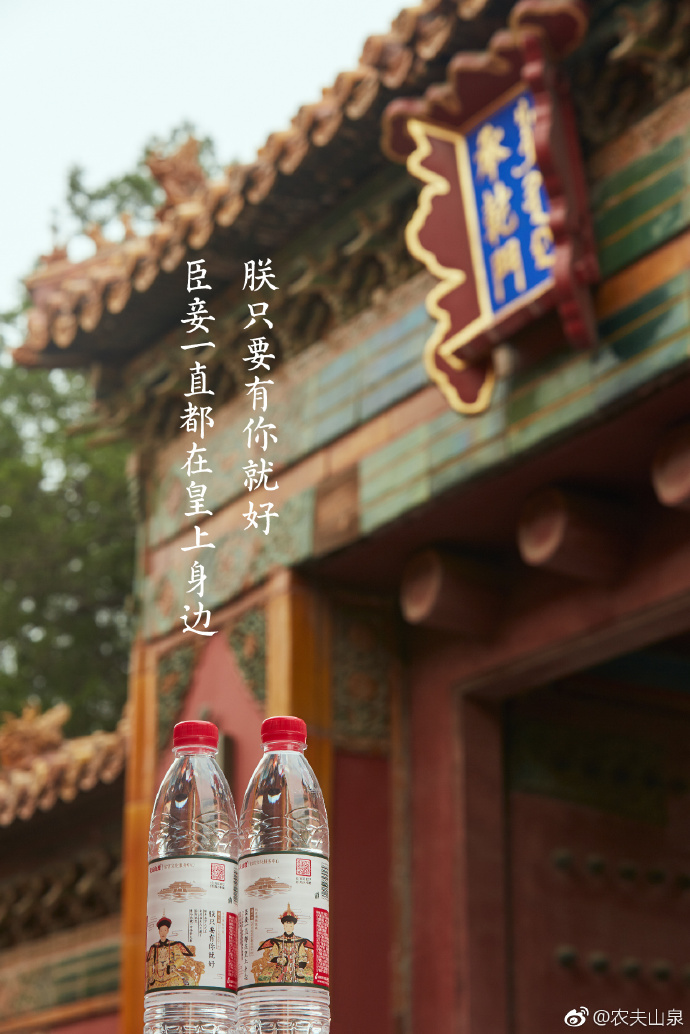 农夫山泉“故宫瓶”的跨界成功,既满足了时代热点中粉丝的追剧心理,也通过机智的文案和唯美的视觉将故宫文化和农夫山泉融合在一起,用康雍乾三代帝王以及后妃们的人物画像为设计主体,搭配了“朕打下的一瓶江山”、“本宫天生丽质”等创意文案,打破了故宫一贯严肃的古板影响,文化气息扑面而来,反差萌效果拉满。
