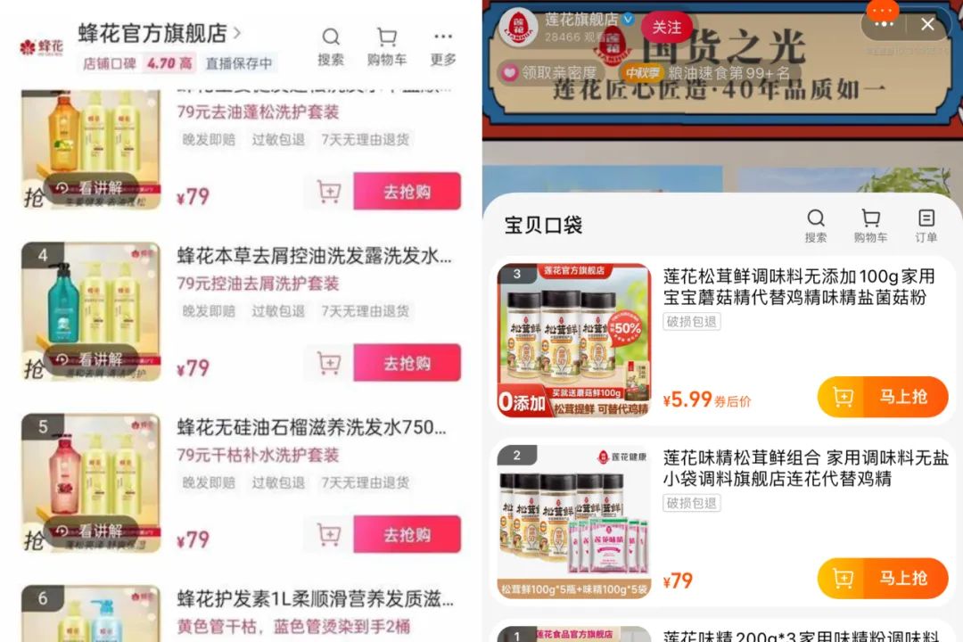 然而,此时老国货蜂花因为上架79元洗护套装而脱销,随手打开@蜂花官方旗舰店 抖音直播间,75元链接的洗护套装售出超百万份,79元套餐在内的十几个链接处于售罄状态。继蜂花后,曾经的“味精大王”莲花味精也迅速在官方店上架79元套餐,相关话题登上微博热搜,引发大量网友涌入直播间购买支持。