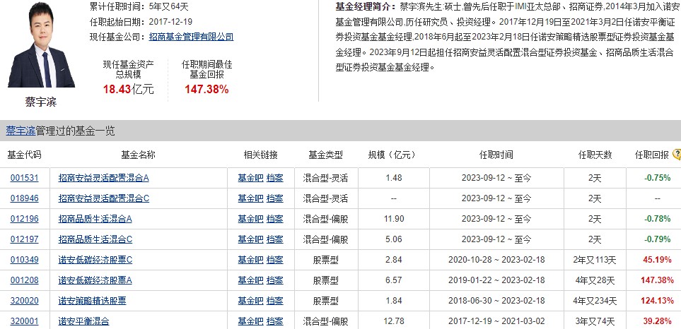 一位名为蔡宇滨的基金经理,从诺安基金跳槽至招商基金,并接手两只老基金。