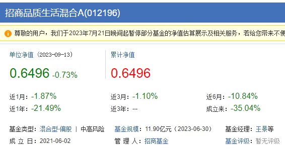成立于2021年6月的招商品质生活,最新管理规模为11.9亿元,累计净值只剩下0.6496,等于产品成立后一直在亏损,跌幅高达35%。