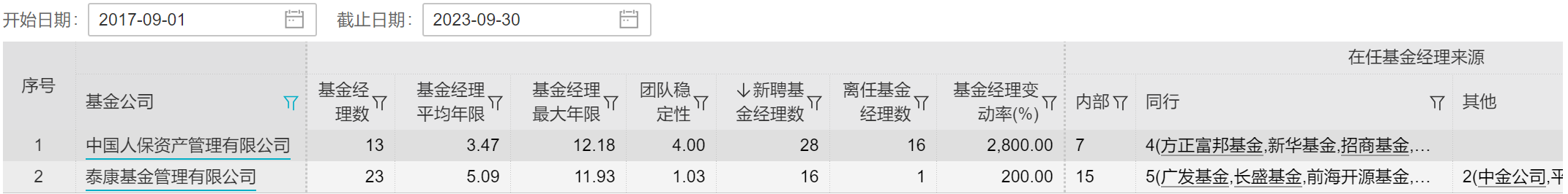 据Wind统计,人保资产基金经理目前存续13名,较泰康基金(泰康资产公募管理子公司)少10人;2017年9月以来,人保资产离任基金经理数16位,新聘基金经理28位,基金经理平均年限3.45年,基金经理变动率2800%,变动率远高于泰康基金。