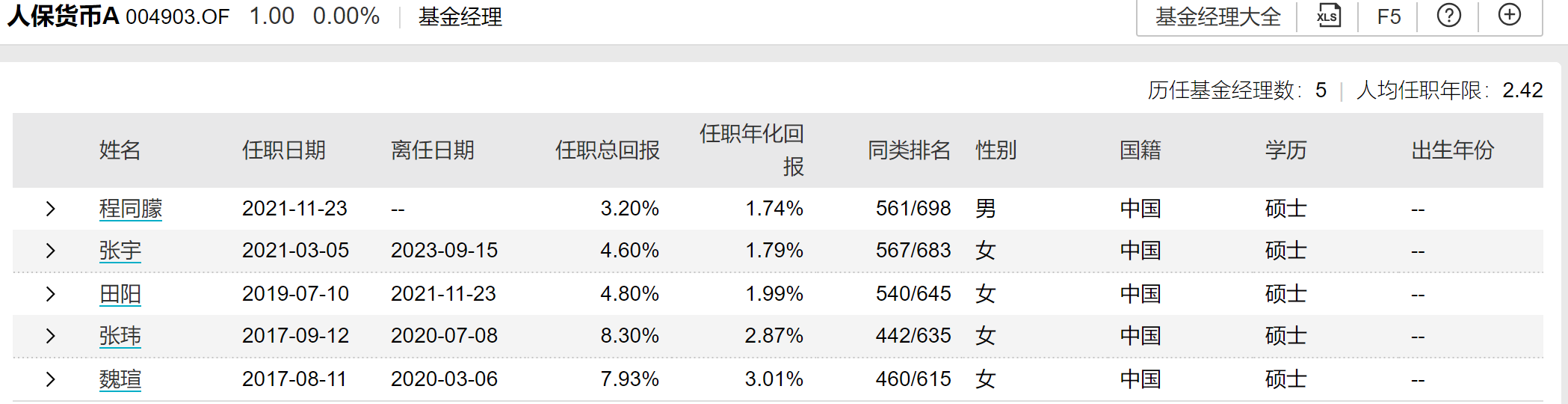 基金中报显示,张宇于2017年9月加入人保资产公募事业部,历任交易员、固定收益基金经理助理,于2021年3月5日起任人保货币基金经理,此后与其共管该只基金的基金经理由田阳换做了程同朦。