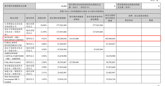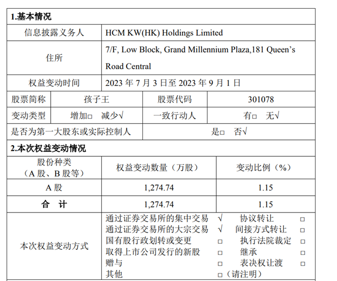 日前,孩子王发布公告显示,其股东持股5%以上股东 HCM KW(HK) Holdings Limited持股比例发生变动,由9.22%变动至8.08%,股份变动数量1274.74万股。