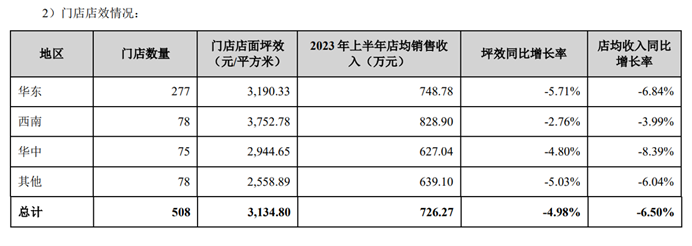 但需要看到的是,收缩开支并没有起到良好的效果,在效率层面,孩子王出现了全线下滑的态势。截至2023 年上半年,孩子王共新增门店 4 家,关闭门店 4 家,期末门店总计 508 家,相当于没有增加,可各地区的门店坪效和店均收入却出现全面萎缩。
