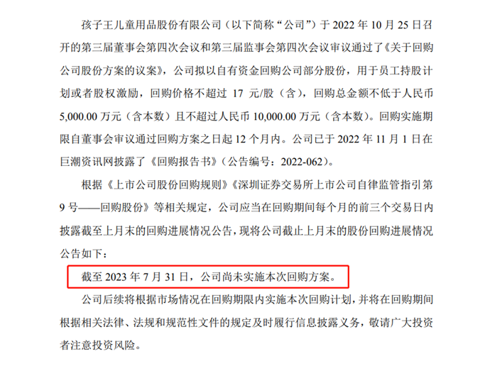 然而,直到今年7月底,回购依然没有实施。直到今年9月12日,孩子王才累计回购了公司股份约264万股,占公司目前总股本的比例仅为0.2374%。