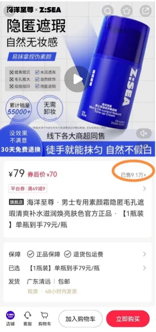 有一次,倪小倩看到喜欢的博主亲自测试一款男士素颜霜,博主擦脸试用,视频显示既滋润又服帖,还有非常好的遮瑕修容作用;该商品还是平台的爆款,已售出9万单。