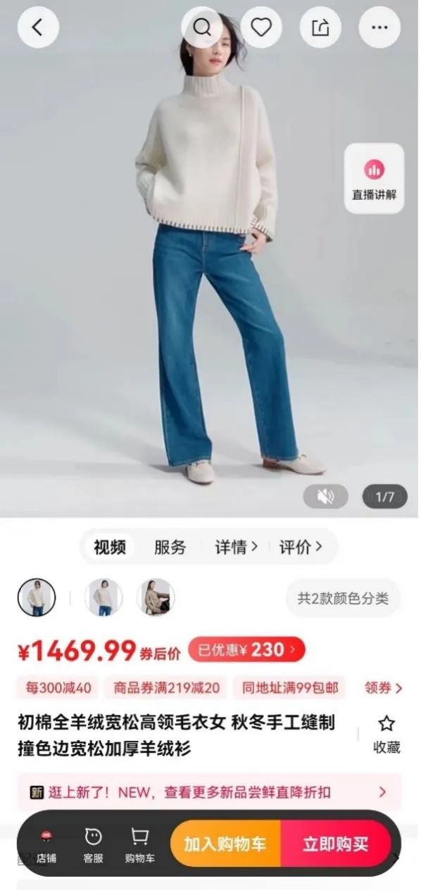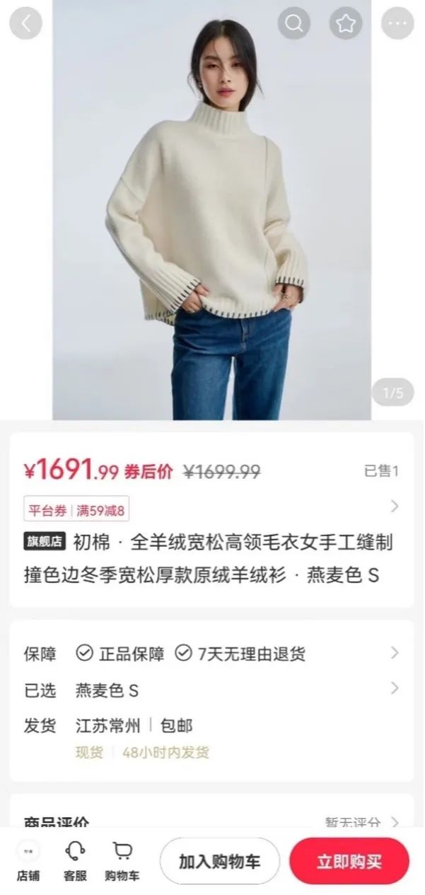 在买手推荐下,记者看中了一款初棉牌的羊绒毛衣,目测质量和款式都非常好,于是通过购物栏找到对应的品牌商家购买,价格是1691.99元,在原价的基础上便宜了9块钱。