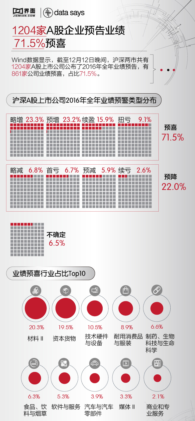 Wind数据显示,截至12月12日晚间,沪深两市共有1204家A股上市公司公布了2016年全年业绩预告,有861家公司业绩预喜,占比71.5%