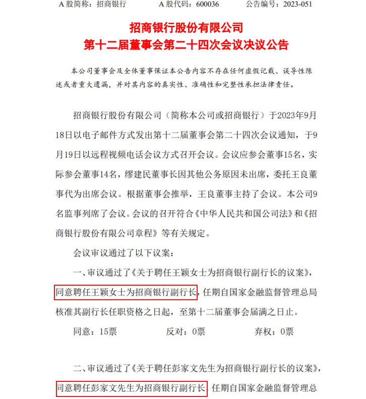 9月19日,招商银行(600036.SH)在董事会上通过了任命王颖和彭家文为副行长的议案。两人都是进入招商银行超过20年的“老将”。