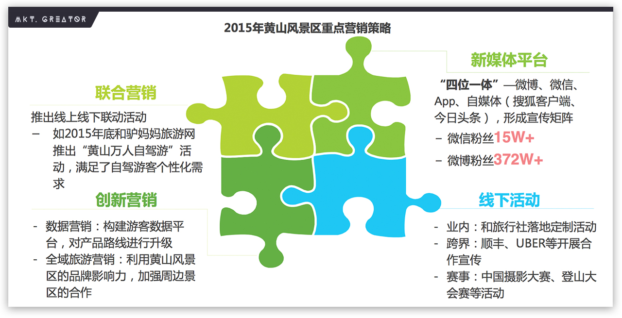 目前黄山风景区在新媒体平台建设、线下活动、OTA联合营销和创新营销方面都有不错进展,始终结合市场变化,走在行业前沿。