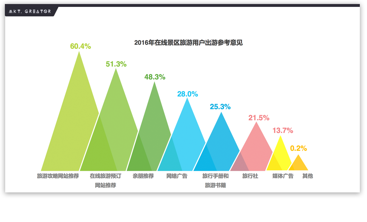 根据艾瑞咨询的分析报告,超过一半的在线景区旅游用户在出游时会参考旅游攻略网站(60.4%)和在线旅游预订网站(51.3%)的推荐。