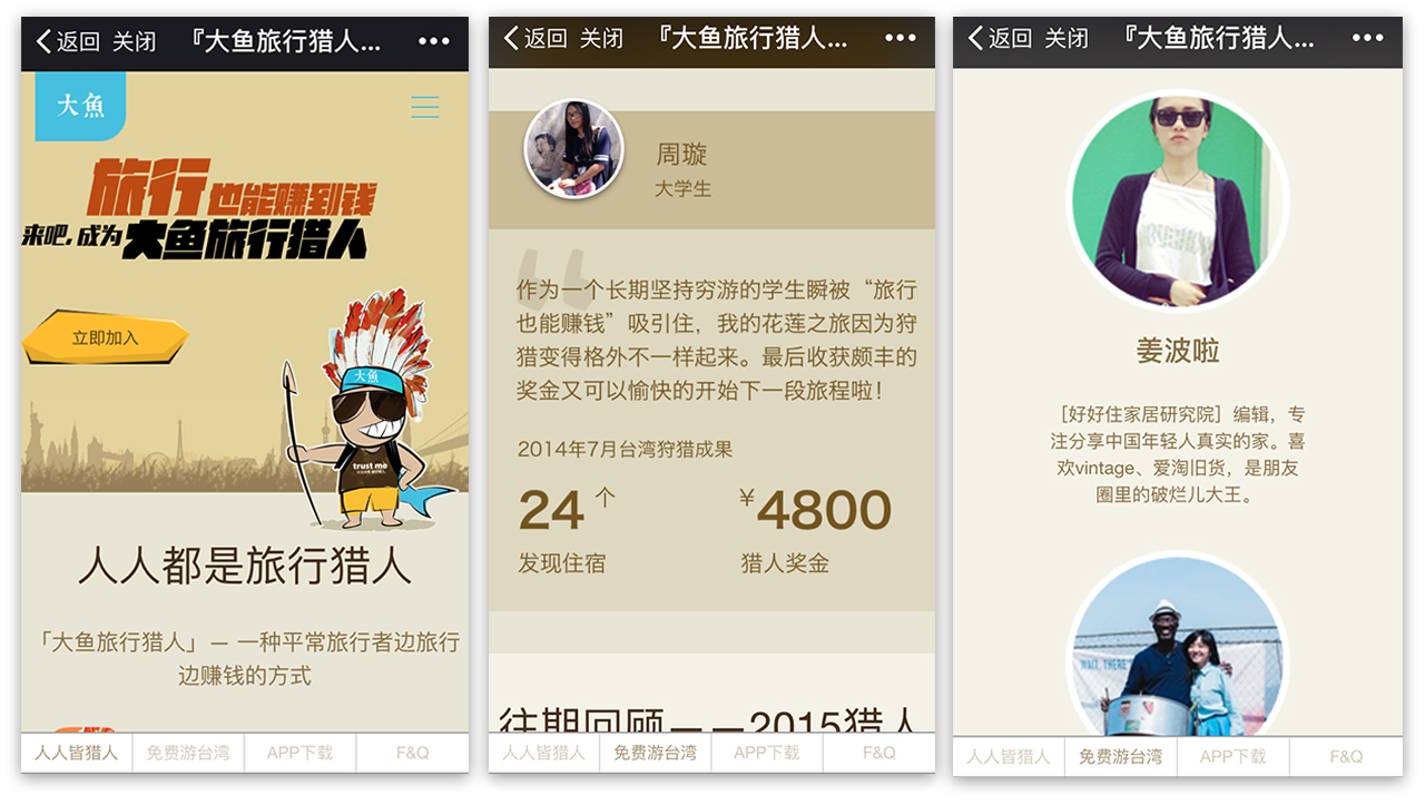 大鱼邀请来自社会各界的旅游爱好者成为旅行猎人,体验最有特色的民宿和旅店。凭借犀利眼光挖掘优质特色住宿,将住宿信息上传到旅行猎人App里,促使大鱼自助游和住宿方达成合作,猎人将获得一定金额的奖励。