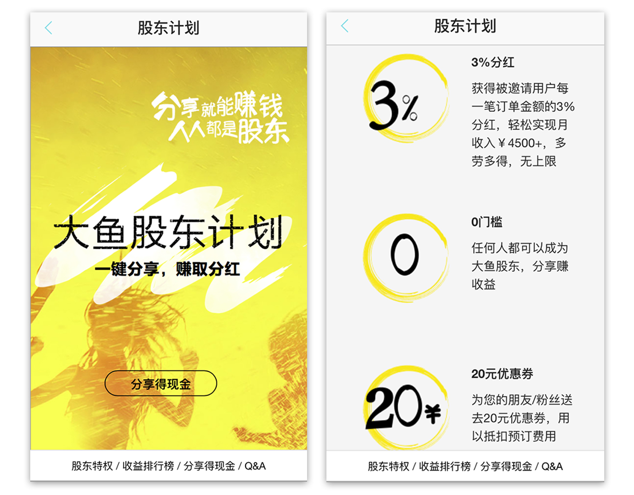 用户通过分享大鱼网站各个目的地特色住宿到任意网站或社交平台,当有其他用户通过点击此分享链接并成功预订大鱼住宿后,分享者即可获得5%的现金分红。