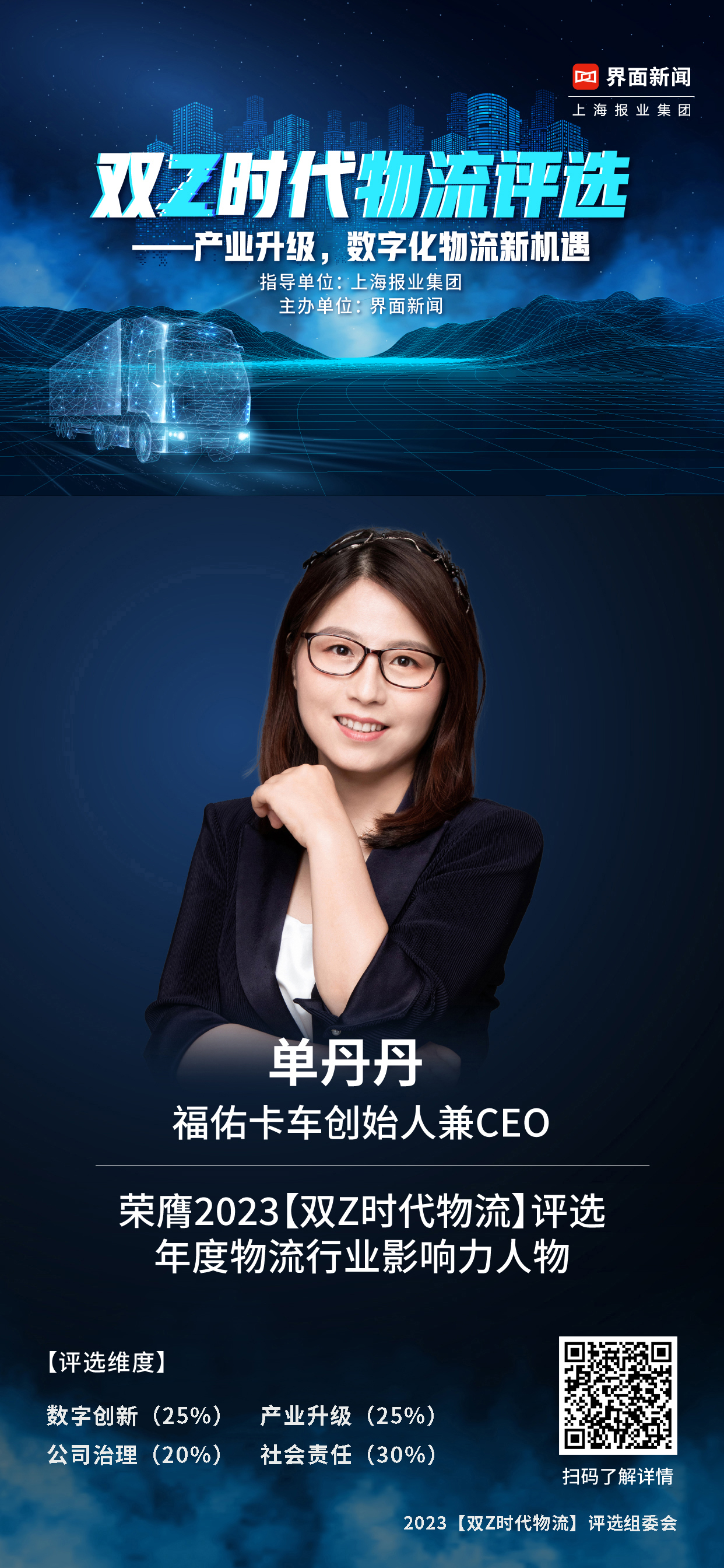 9月21日,由上海报业集团|界面新闻发起的2023【双Z时代物流】评选获奖名单正式公布。此次评选吸引了百余家物流企业共同参与,福佑卡车创始人兼CEO单丹丹凭借在数字创新、产业升级、公司治理和社会责任等方面的卓越表现,荣膺年度物流行业影响力人物称号。