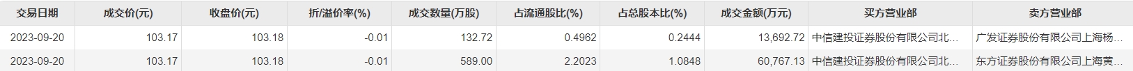 9月20日,华大九天今日出现7.45亿元折价大宗交易,成交价103.17元/股(今日收盘价103.18元),买方为中信建投北京太平桥路证券营业部,卖方为东方证券上海黄浦区中山南路第一证券营业部、广发证券上海杨树浦路证券营业部。