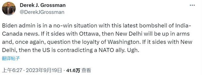 如果美国支持加拿大,印度会跳脚并质疑美国拉拢印度的忠诚度;如果美国支持印度,则意味着美国与一位北约盟友作对。罗斯曼最后用一个语气词“咳”总结了美国的处境。