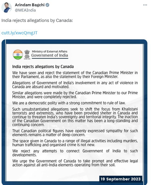声明特别指出,对于加拿大政府的长期不作为以及加拿大政客公开同情分离主义人士,印度表示“ 严重关切”。