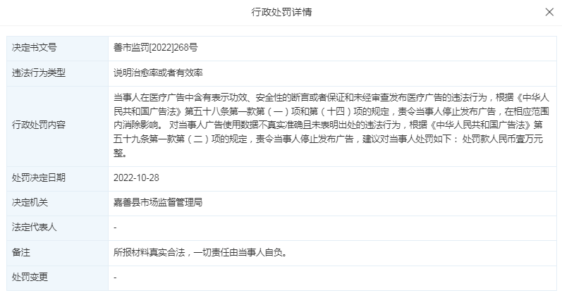 除持续亏损外,「子弹财经」还发现马泷齿科曾被监管机构频繁处罚。天眼查显示,2022年10月28日,马泷齿科因广告使用数据不真实、准确且未标明出处的行为被浙江省嘉善县市场监督管理局处以1万元罚款。