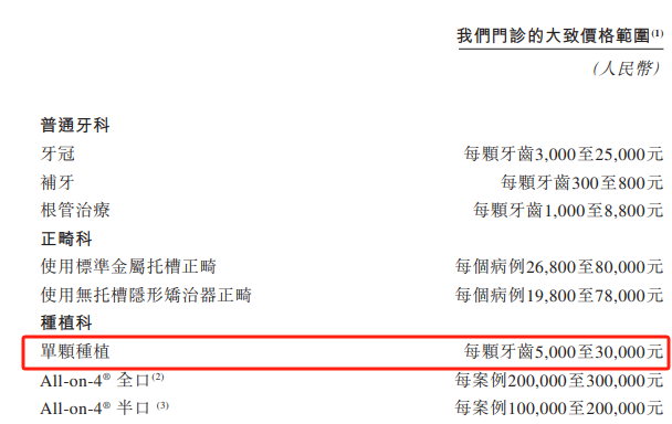 值得注意的是,由于马泷齿科走中高端消费路线,公司种植牙费用非常高昂。招股书显示,马泷齿科门诊单颗种植牙价格在5000元至30000元之间。集采落地后,为了保留原有客户,各大牙科诊所开启价格战在所难免。