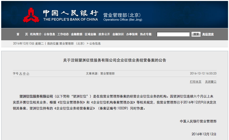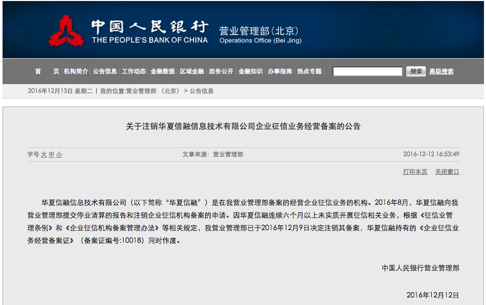 央行公告显示,望洲征信、华夏信融均连续六个月以上未实质开展征信相关业务,根据《征信业管理条例》和《企业征信机构备案管理办法》等相关规定,央行营业管理部于2016年12月9日决定注销备案,这意味着两家分别持有的《企业征信业务经营备案证》作废。