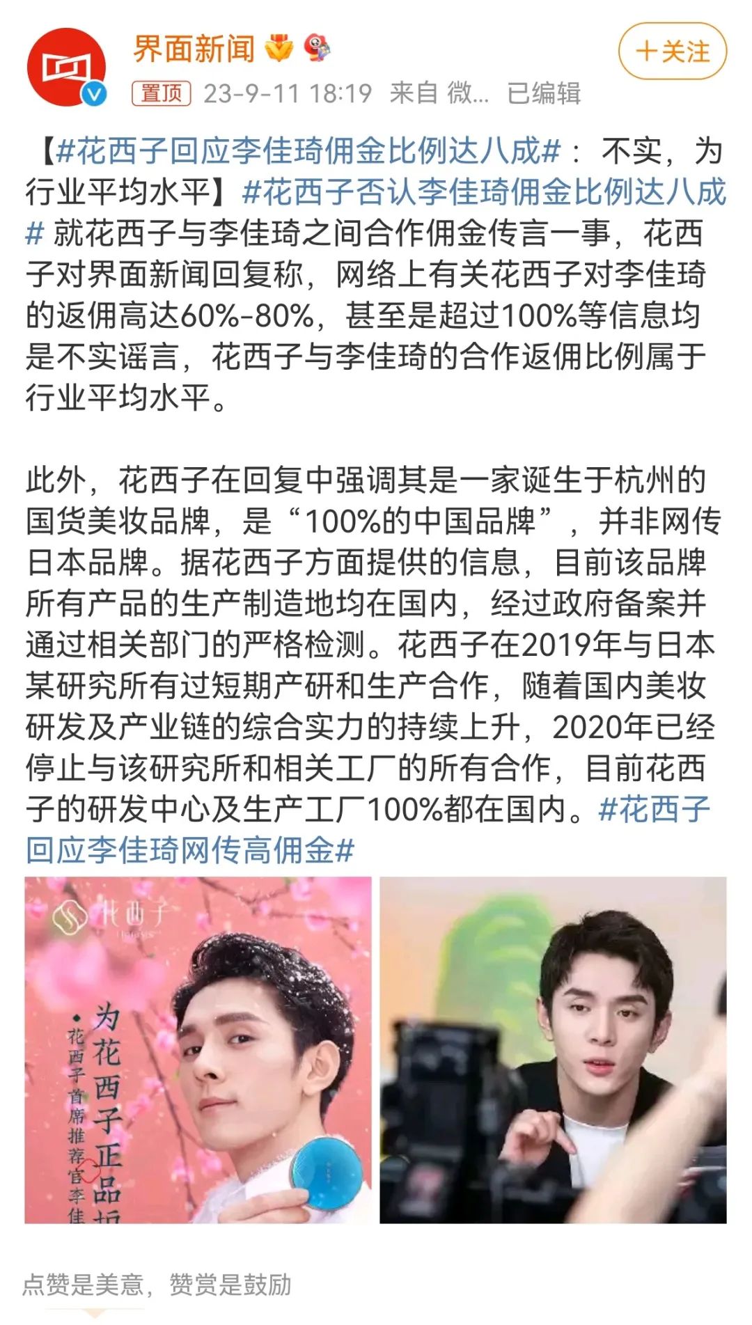 “据我所知80%佣金这样的说法是极大夸张的,即便花西子和李佳琦绑定很深,依赖度很高,但也没有到这样的程度。这样的爆料很多是搅浑水的,品牌不出来正面回应,可能是因为没有办法直接公布合作模式和佣金,也可能觉得这个话题比较敏感,不好直接和大众讲。”某与李佳琦有过接触的品牌供应商告诉剁椒。