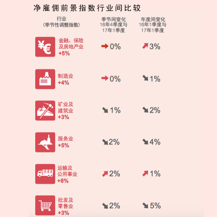 该调查是基于对中国大陆地区4217家企业雇主的抽样访问结果而得到的。调查内容主要为2017年1月到三月企业的招聘或裁员计划,用希望在下一季度中增加员工人数的雇主比例减去期望减少员工人数的雇主比例得出净雇佣前景指数。结果发现,中国大陆在全球43个被调查国家或地区中,排在第35位,净雇佣前景指数为4%。与去年同期相比,下降了3个百分点。