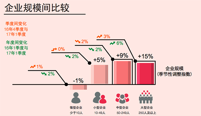 还记得万宝盛华的上次预测吗,大型企业与中型企业在2016年第四季度中经雇佣前景指数均为10%,到了2017年第一季度,大型企业的雇佣前景指数大幅度上升到15%,而中型企业的该指数则为9%。“大型企业正在通过不断收购获得新技术,这一趋势还将继续。”张锦荣表示,“大型企业在创新领域投资的增加,相应地促进了他们对创新人才的需求。”