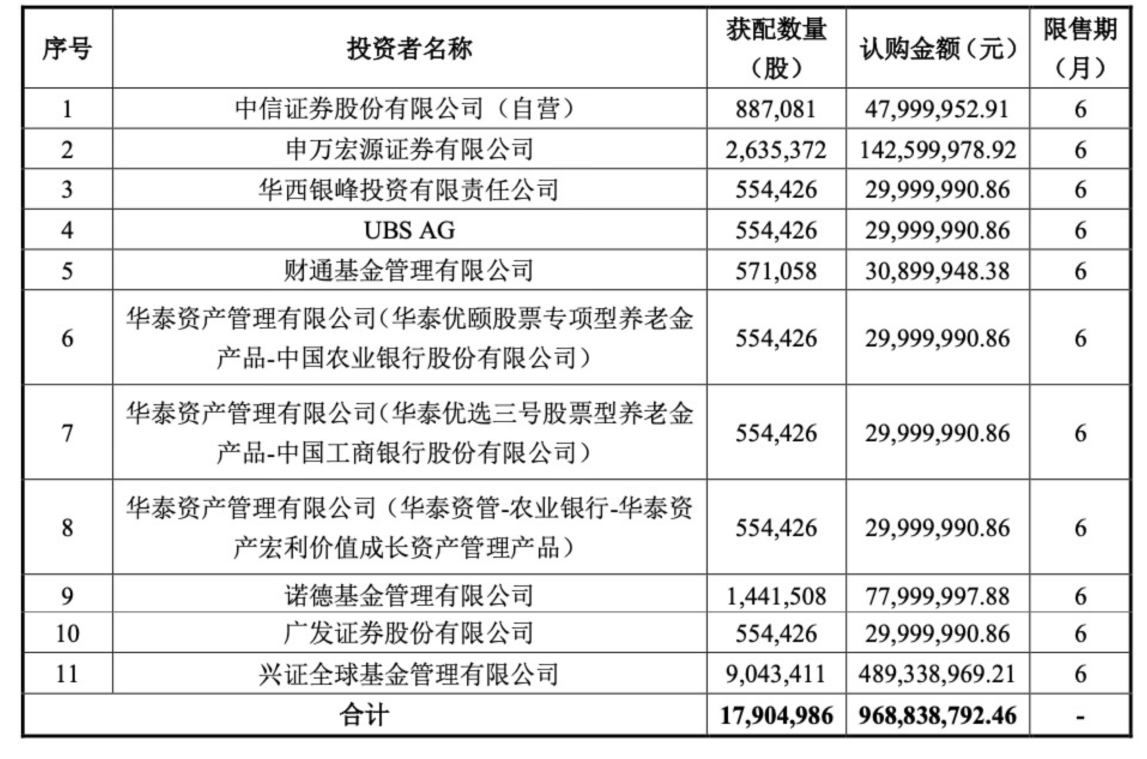 除了兴全基金外,参与本次定增的还有多家机构。诺德基金、财通基金分别获配144.15万股、57.11万股,分别耗资0.78亿元、0.31亿元;申万宏源证券、中信证券、广发证券分别获配263.54万股、88.71万股、55.44万股,分别耗资1.43亿元、0.48亿元、0.3亿元;华泰资管获配166.33万股,耗资0.9亿元。华西银峰投资以及外资机构UBS AG各自获配55.44万股。