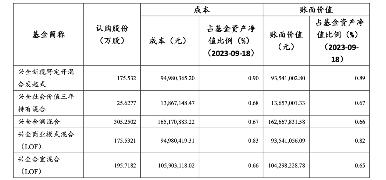 公告显示,乔迁管理的兴全新视野、兴全商业模式优选,谢治宇参与管理的兴全社会价值三年持有、兴全合润、兴全合宜一起参加了芯朋微本次定增。上述5只基金分别认购175.53万股、25.63万股、305.25万股、175.53万股、195.72万股,合计877.66万股,总成本合计4.75亿,公告显示9月18号的账面价值总计4.68亿元。