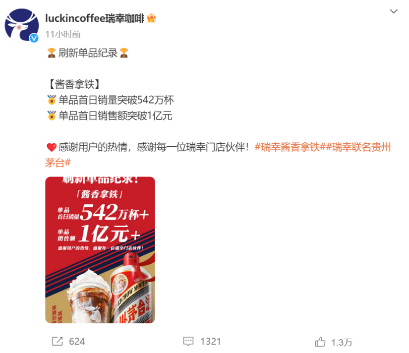 作为白酒届与咖啡届绝对的顶流,二者联名消息一经放出,网友便沸腾了起来,一时线下出现一杯难求的盛况。当天,酱香拿铁销售火爆,刷新了瑞幸单日的销量与销售额纪录。