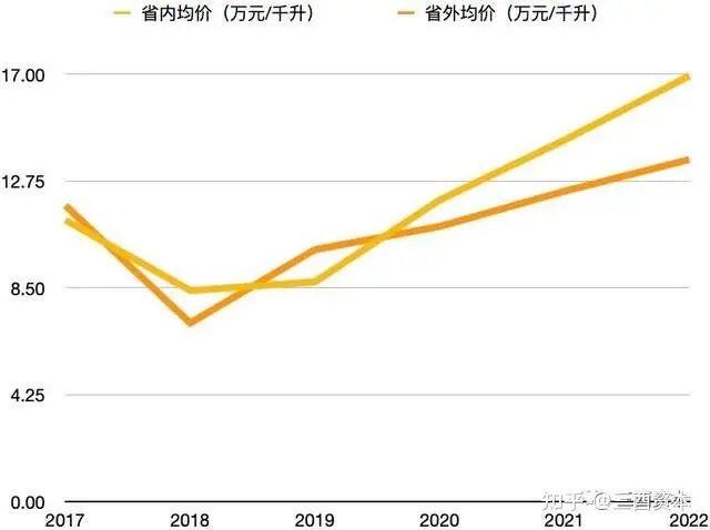 但在全国化如火如荼开展的过程中,汾酒也并非毫无烦恼。其中,高端化与全国化战略便无法统一进行。从下图中可以看出,省内均价长期持续压制省外均价上行。