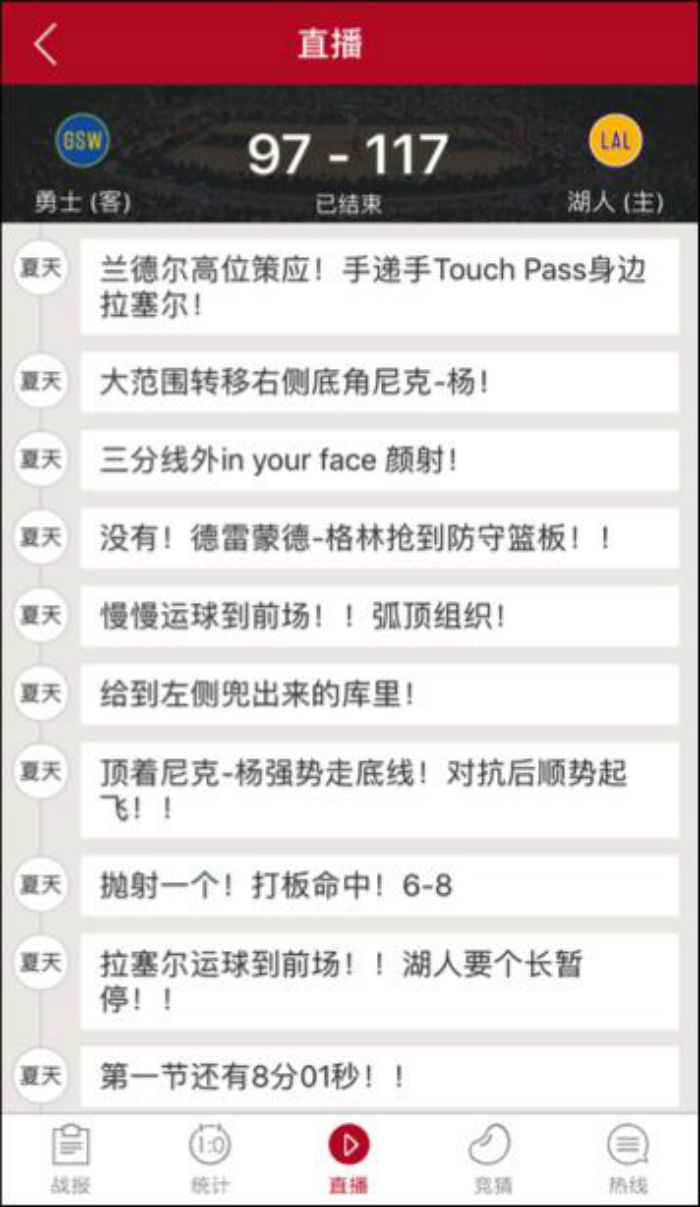 举例来说,这是“虎扑体育”应用上,夏天对勇士与湖人队比赛进行的文字直播解说的截图: