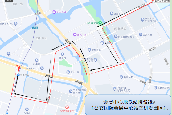 站点设置:公交国际会展中心站(会展中心地铁站)、会展路启新路口↓、河清北路会展路口↓、会展路河清北路口↑、河清北路通途路口↑、均胜翡翠湾、科技公园、创业大厦、宁波市软件园、扬帆路聚贤路口↑、宁波研发园北、研发园区。