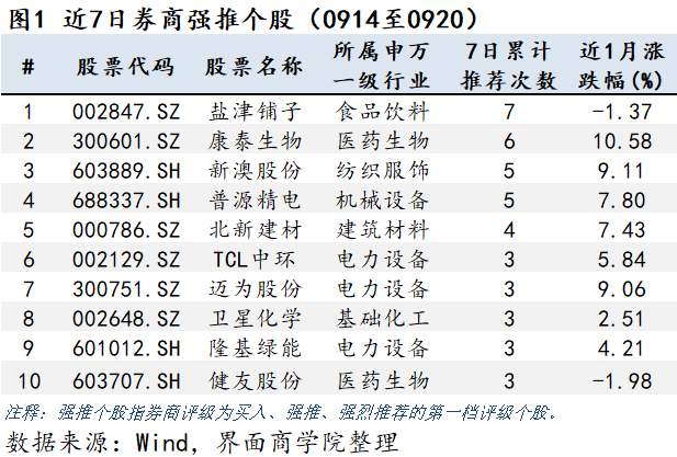 上图将券商近7日(9月14日至9月20日)推荐的个股按被推荐次数由高到低排序。共有65只个股得到券商周内多次推荐。
