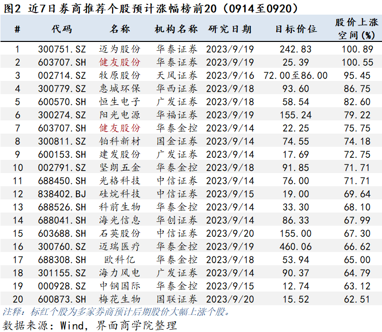 上图将券商近7日(9月14日至9月20日)推推荐的个股按预期股价上涨空间由高到低排序,股价上涨空间计算基数均以最新交易日收盘价为准,其中券商目标价通常指未来3至6个月券商预测目标价。其中,华泰证券预测迈为股份(300751.SZ)以及健友股份(603707.SH)将实现翻倍涨幅。
