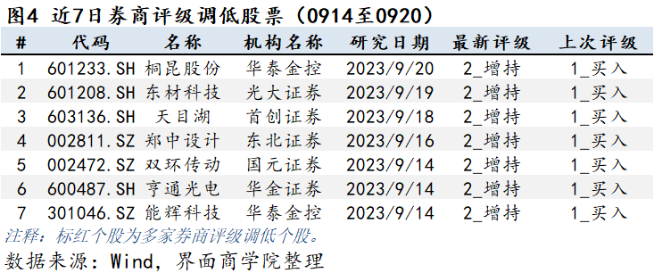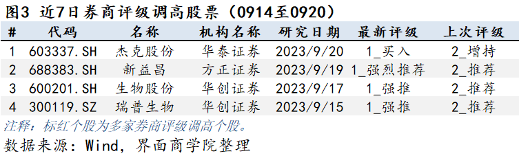 券商对上市公司的观点通常保持连贯一致,但当市场情况或公司基本面发生较大改变,券商对上市公司判断发生改变时会调整相应的公司评级。上图为券商个股在过去一周的评级上调情况,按研报日期排序。券商评级数字为1即为第一档,即最佳,5为最末档,即最差。由于各券商对评级的文字描述不尽相同,所以评级调整以评级数字为准。