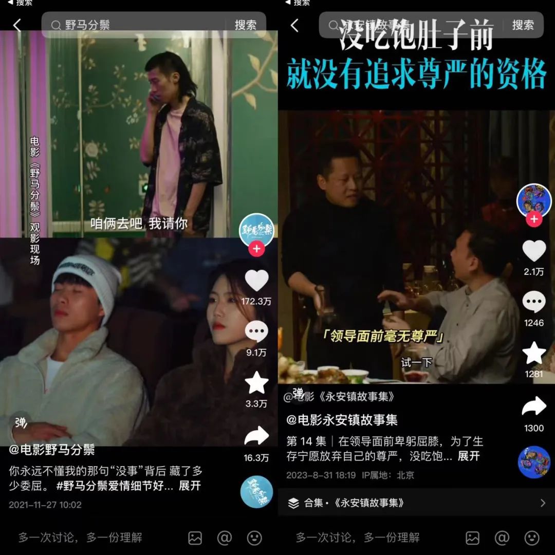 《永安镇故事集》导演魏书钧的上一部影片《野马分鬃》,在短视频如法炮制爱情片宣发,收获了一千多万票房。现在《永安镇故事集》试图在短视频上营销小人物苦情向短视频,但已没有效果。
