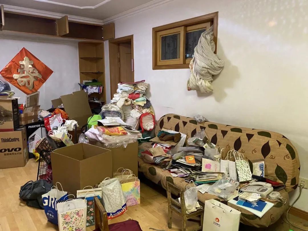 我们每天从早上九点收拾到晚上十一点,回家都已精疲力尽。收拾时间最长、也最困难的地方是客厅和主卧,因为杂物堆积太多,除了垃圾,还有照片和信件需要仔细辨认。整理时总会扬起很多灰尘,中途也受网友提醒,我和母亲戴上了口罩和手套。