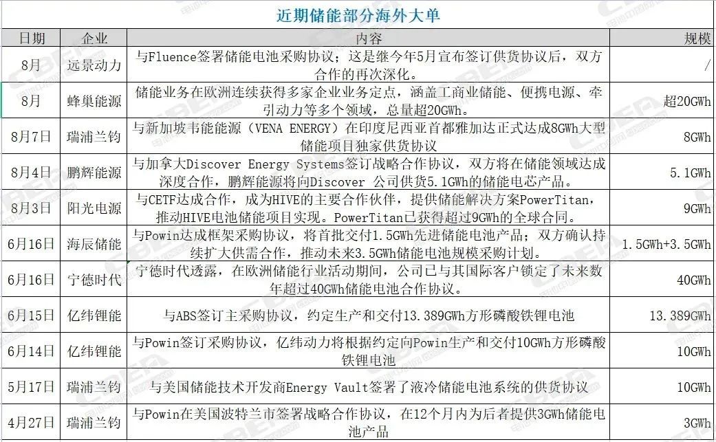 2023年8月,一共有5家储能企业拿下海外订单,创了年内的新高,其中蜂巢能源的储能业务在欧洲连续获得多家企业的业务定单,涵盖工商业储能、便携电源等多个领域,总量超20GWh。