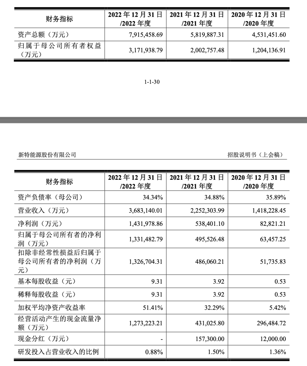招股书显示,2020-2022年,新特能源营业收入分别为141.82亿、225.23亿、368.31亿元;归母净利润分别为6.35亿、49.55亿、133.15亿元;扣非归母净利润分别为5.17亿、48.61亿、132.67亿元。