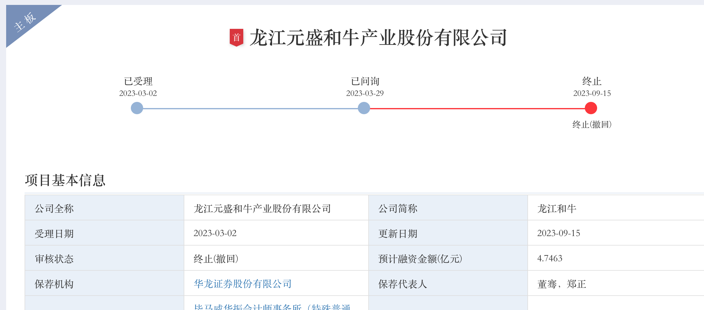 据深交所披露,龙江元盛和牛产业股份有限公司(下简称:龙江和牛)目标主板,3月29日进入问询环节,公司在6月26日还披露了回复意见,时隔近半年,该公司突向交易所提交了撤回首发的申请,其保荐人华龙证券也同步选择了撤回,由此,龙江和牛的IPO之旅告一段落。
