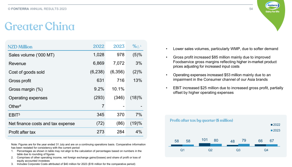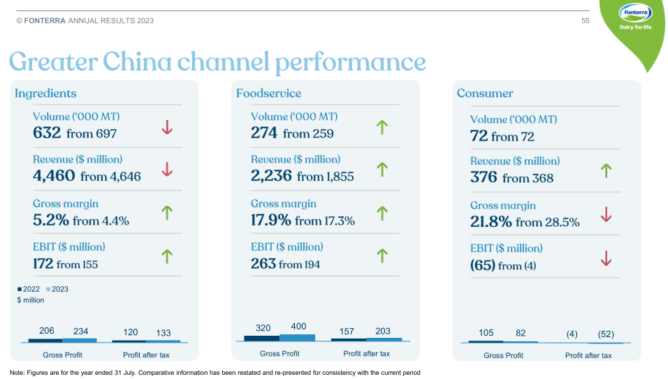 整体而言,随着疫情期间出行受限的解除,中国的乳制品消费量持续增加。不过,由于中国本地乳企将过剩原奶转化为全脂奶粉,降低对进口全脂奶粉的需求,从而影响了该集团在华全脂奶粉的销量。