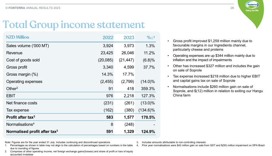 今天,恒天然集团CEO郝万里(Miles Hurrell)在通报中表示,恒天然在2023年实现了强劲盈利,并在关键战略举措方面取得了进展。“我们实施了新的灵活持股的资本结构,完成了中国牧场和智利Soprole业务的出售,并启动了新的名为营养科学解决方案(NSS)的风投部门。”